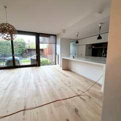 Once sanded, the engineered timber floor was sealed with a waterbased polyurethane finish. This type of finish is perfect for engineered boards—it enhances the natural timber grain, provides long-lasting durability, and avoids the yellowing effect that solvent-based finishes can cause. The result was a floor that looked refreshed, lighter, and beautifully protected.