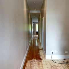 Once sanded, the colour difference between the front and back of the property remained strong. To soften the depth of the Jarrah and bring it closer in tone to the Baltic Pine, we applied a specialist timber bleaching process. Bleaching Baltic Pine and Jarrah flooring lightened the Jarrah’s intense red tones, helping reduce the contrast while keeping the timber’s character intact.